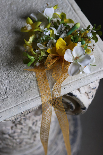 W kompozycji zostały wykorzystane drobne sztuczne kwiaty najwyższej jakości - m.in. kwiaty jabłonki i bukszpan, które świetnie naśladują swoje żywe odpowiedniki.
