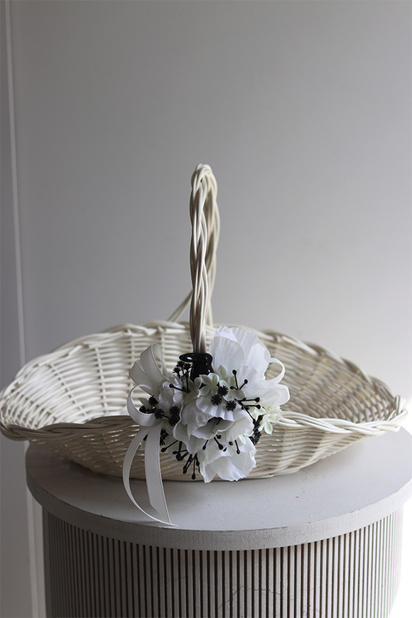 Koszyczek wielkanocny Anemony Violet, przyozdobiony kompozycją z wiosennych kwiatów w czarno-białej tonacji, podkreśloną przez koronkowe wstążki. Wiosenna dekoracja wykonana została z wysokiej jakości sztucznych elementów.