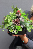 Wyjątkowa kompozycja z sukulentami w okrągłej, lekko spłaszczonej, czarnej donicy.