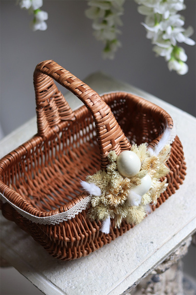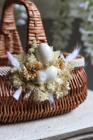 Koszyczek wielkanocny Berta, przyozdobiony subtelną dekoracją ze sztucznych kłosów i piór.