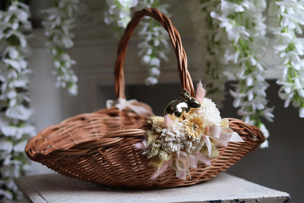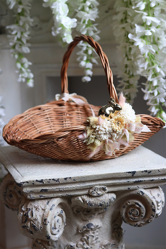 Koszyczek wielkanocny Dukana, przyozdobiony subtelną dekoracją ze sztucznych kłosów i sztucznych kwiatów.