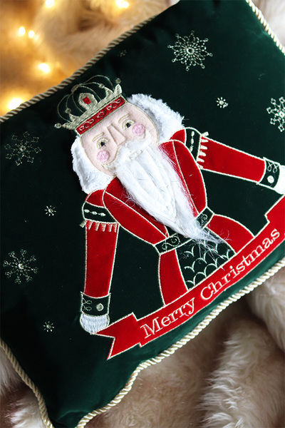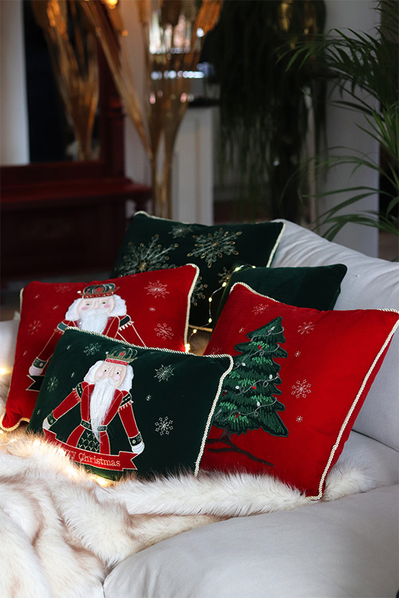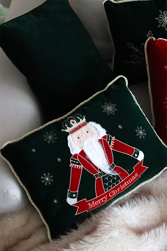 Piękna, welurowa poduszka zdobiona świątecznym motywem mikołaja.