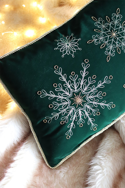 Piękna, welurowa poduszka zdobiona świątecznym motywem śnieżynek.