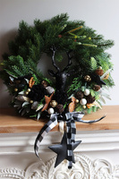 Wianek wykonany jest na bazie realistycznych zielonych gałązek iglastych, ozdobionych asymetryczną dekoracją z szyszek, gwiazdek, pierników i suszonych pomarańczy.