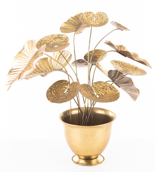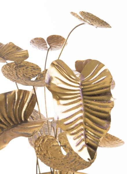 Stylizowany, ozdobny metalowy stojak z oryginalną imitacją rośliny doniczkowej anturium w złotym kolorze. Dekoracja w nowoczesnym stylu, zachowana w konwencji prostoty i elegancji.