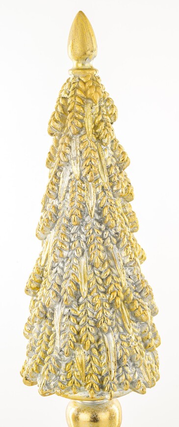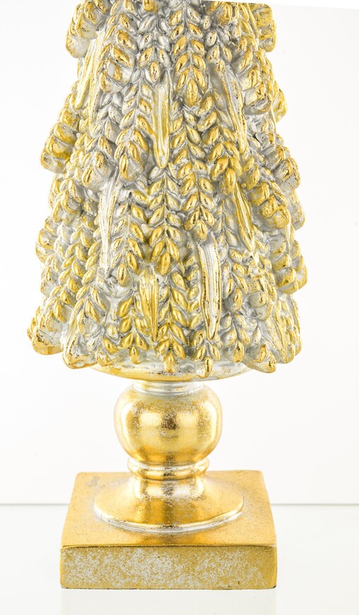 Figurka złotej, choinki, świerku o naturalnych kształtach drzewka, zamiast gałęzi oryginalna improwizacja w kształcie kłosów zboża. Piekna, artystyczna dekoracja świąteczna, może stanowić klasyczny dodatek do dekoracji stołu, komody, parapetu okiennego. Urocza propozycja na prezent.