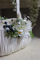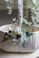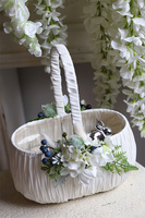 Koszyczek wielkanocny Delina, przyozdobiony kompozycją z delikatnych białych kwiatów podkreślonych niebieskkimi kulkami głogu. Wiosenna dekoracja wykonana została wyłącznie z wysokiej jakości sztucznych elementów. Kompozycję dopełnia cermaiczna figurka zająca.