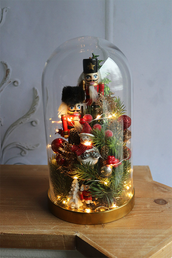 Wszystko to zamknięte zostało pod szklaną kopułą ze złotą podstawą i oplecione światełkami LED.