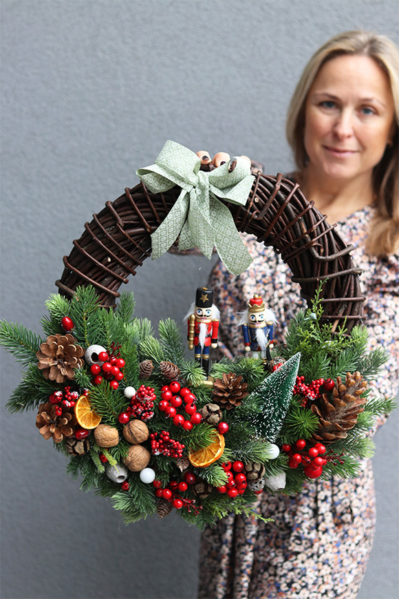 <...Uroczy ozdobny wianek ze świąteczną dekoracją z zielonych gałązek, owoców, szyszek i suszonych pomarańczy. W centrum kompozycji umieszczone zostały dwie figurki dziadków do orzechów.