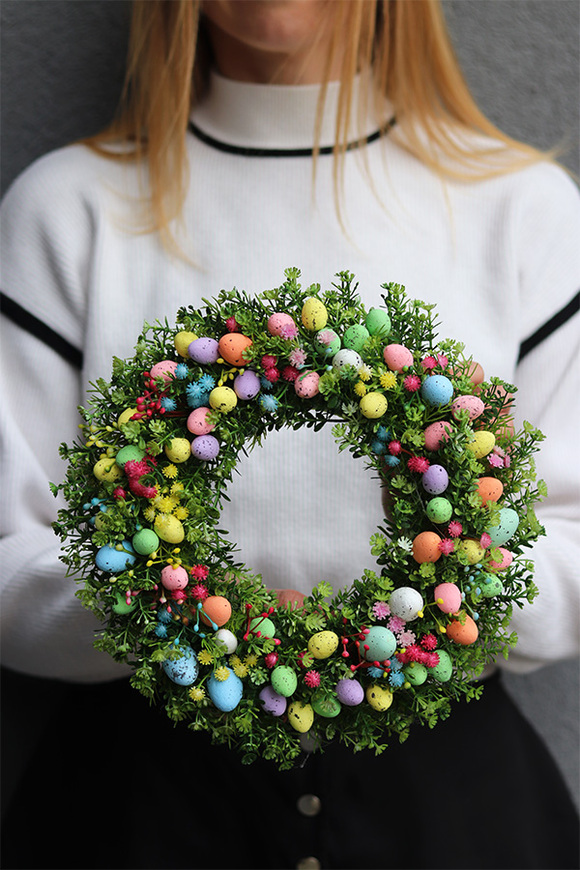 ...Bajeczny wianek z bogatą dekoracją z bogatej mieszanki drobnych jajeczek w tęczowych kolorach.