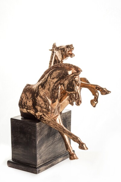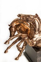 Elegancka złota figurka z wysokiej jakości tworzywa, przedstawiająca piękne sylwetki koni utrzymana w prostej, nowoczesnej stylistyce. Figurka glamour jest elegancką dekoracją do każdego wnętrza.