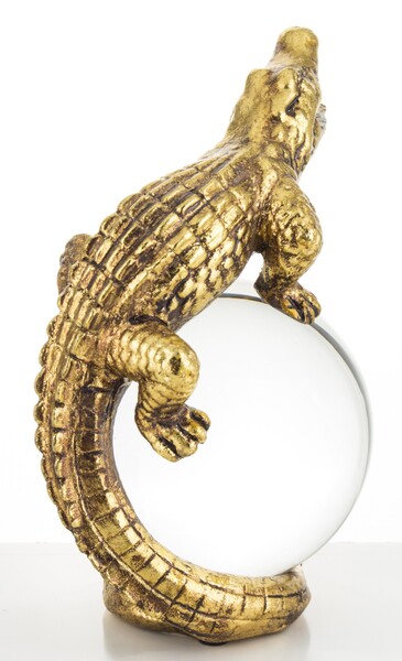 Elegancka złota figurka z wysokiej jakości tworzywa, przedstawiająca krokodyla na kryształowej kuli.