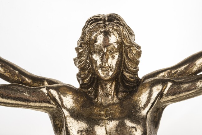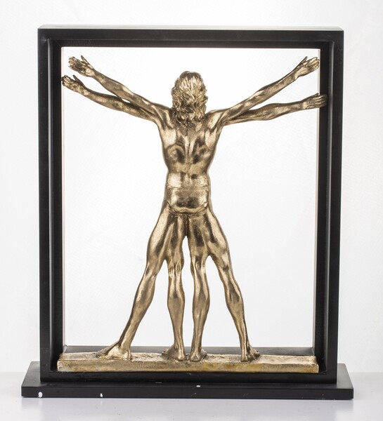 Elegancka złota figurka z wysokiej jakości tworzywa, przedstawiająca postać, nawiązująca do szkicu Leonarda da Vinci.