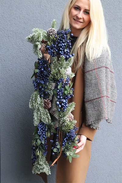 Dekoracyjna girlanda z granatowymi owocami, szyszkami i zielonymi gałązkami.