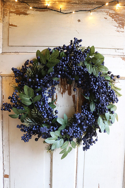 Dekoracyjny wianek z granatowymi owocami i zielonymi gałązkami.