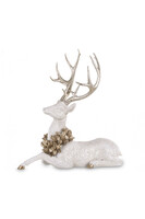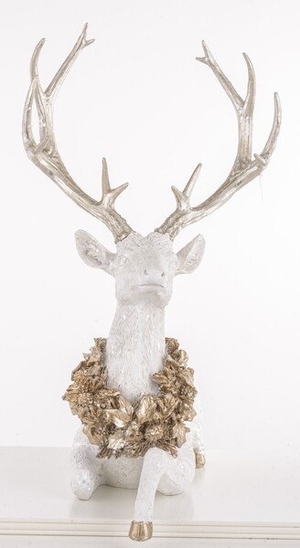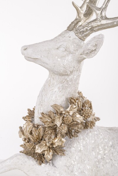 Wyjątkowa figurka okazałego jelenia z pięknym porożem w śnieżnych, mieniących sie barwach w wieńcu na szyi. Oryginalna ozdoba świąteczna do dekoracji mebli, stroika i kompozycji.