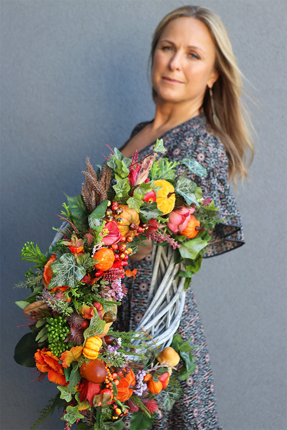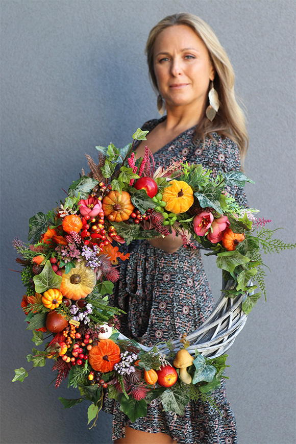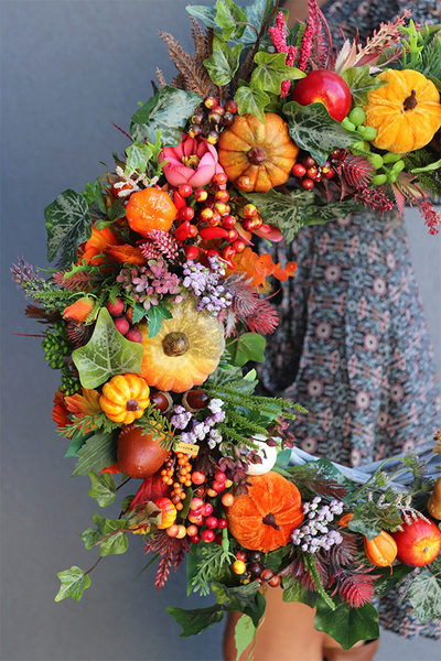 Gustowny wianek w bajecznych kolorach polskiej, złotej jesieni, przywołujący na myśl najpiękniejsze wspomnienia i malowniczy Kazimierz nad Wisłą u progu jesieni. Wianek bogato dekorowany gasnącą zielenią liści i bluszczu, złoto-czerwonymi koralami ogrodowych krzewów, uroczymi dyniami, jabłkami, wrzosami i kwiatami odchodzącego lata.