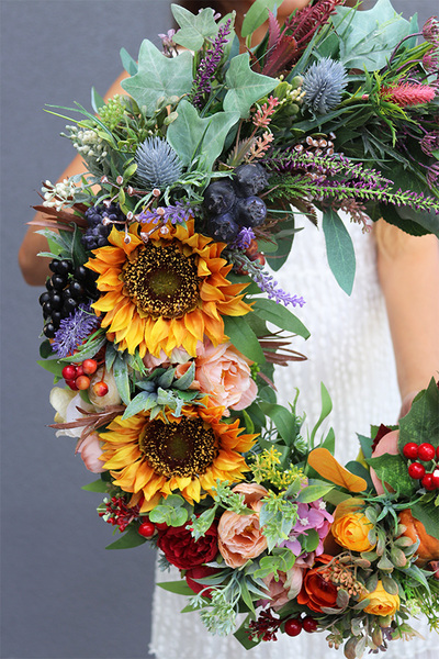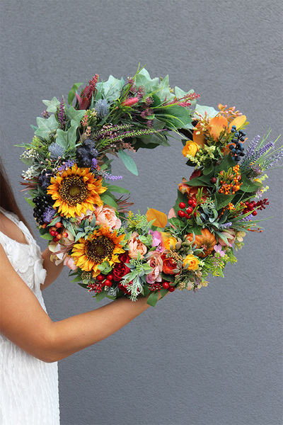 Wianek jest dodatkowo ozdobiony koralami dzikich, leśnych krzewów i wrzosami a główną rolę grają tu okazałe kwiatostany słoneczników.