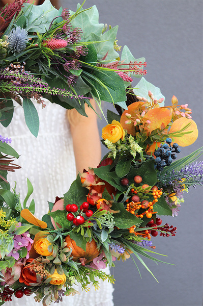 Gustowny wianek w zgaszonych zieleniach i przyćmionych oranżach, oddający doskonale klimat nadchodzącej dojrzałej roku - jesieni.