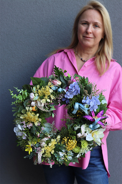 Piękny wiosenny wianek z asymetryczną dekoracją z kolorowych kwiatów w wiosennych barwach.