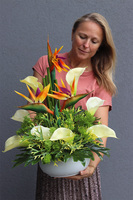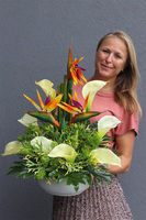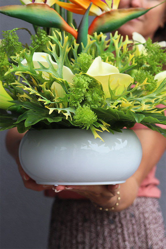 Kompozycja Kedura w białej, ceramicznej misie ułożona w stylu japońskiej ikebany z kwiatów strelicji, pędów zielonego bambusa, kalii i zielonych kiści sukulentów i tropikalnych liści drzew.