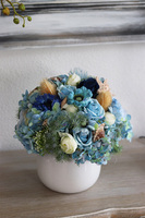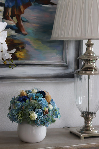 Gęsto splecione niebieskie kwiaty róż, hortensji i niezapominajek, przetkane zostały muszelkami i suszonymi roślinami.