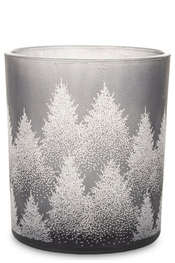 Uroczy szklany świecznik na teelighty z motywem ośnieżonego, zimowego lasu.