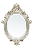 Eleganckie owalne lustro oprawione w srebrną ramę w stylu barokowym.