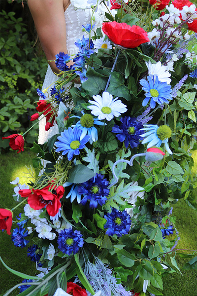 Niezwykle efektowna dekoracja, pełna okazałych maków, chabrów, rumianków, lilii i wielu innych kwiatów, które zdają się wyrastać spośród soczyście zielonych gałązek.