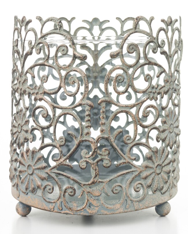 Uroczy, metalowy lampion w szarym kolorze, o koronkowej osłonce. Lampion posiada szklaną podsatwę do świecy.