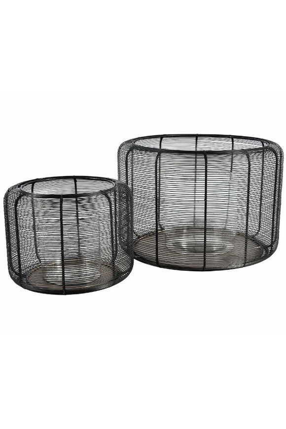 Stylowy lampion z czarnym stelażem o ażurowej konstrukcji. wewnątrz znajduje sie szklany klosz na świecę.