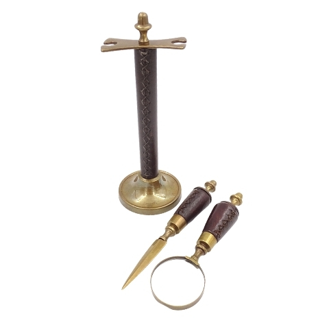 Nóż do papieru i szkło powiększające z rączkami w oprawie skórzanej na stojaku.
