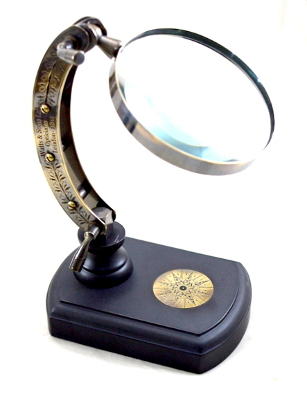 Dekoracyjne mosiężne szkło powiększające na podstawie. Możliwość regulowania pochylenia ramienia i samego szkła. Szkło można ustawiać pod różnym kątem i na różnej wysokości. Wymiary: wys. 22cm. Szer. 13cm, gł. 9,5cm Ramię i prawa strona szkła wykonane z mosiądzu, podstawa drewniana. Na podstawie mosiężna plakietka - symbolika - róża wiatrów Replika angielskiego szkła...