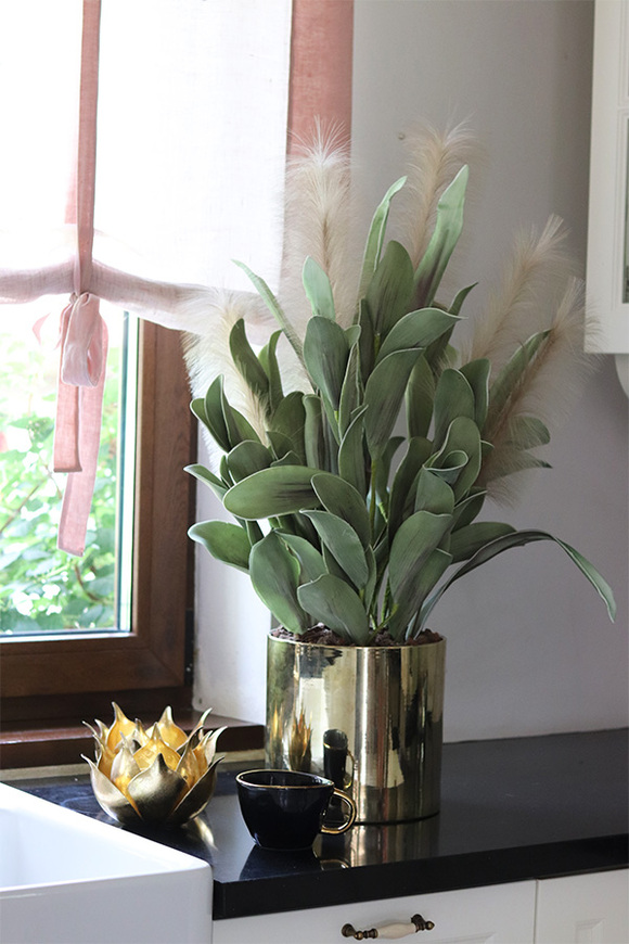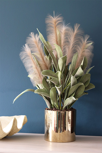 Modna i efektowna dekoracja wykonana ze sztucznych roślin o delikatnych, piankowych liściach, uzupełnionych o efektowne pióropusze traw pampasowych.