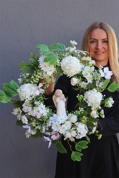Delikatny kwiatowy wianek zabudowany białymi kwiatami. Piękne, jasne kolory sprawią, że z przyjemnością zawiesisz go na swoich drzwiach. W centrum wianka znajduje się urocza figurka aniołka.