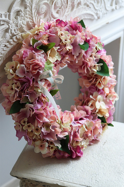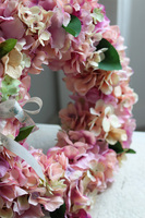 Subtelny wianek z różnorodnych hortensji w stonowanych odcieniach różu, przetkany delikatnymi listkami i udekorowany subtelną wstążką.