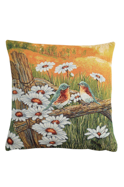 Gobelinowa poszewka dwustronna z ilustracją przedstawiającą ptaki na tle łąki z kwitnącymi rumiankami.