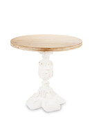 Okrągły stolik z drewnianym blatem, na pięknej, ozdobnej, toczonej nodze malowanej na biało z artystycznymi przecierkami. Mebelek jest uroczą ozdobą kuchni, salonu a także rustykalnego wnętrza.