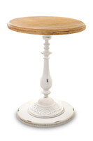 Okrągły stolik z drewnianym blatem, na pięknej, ozdobnej, toczonej nodze malowanej na biało z artystycznymi przecierkami. Mebelek jest uroczą ozdobą kuchni, salonu a także rustykalnego wnętrza.