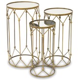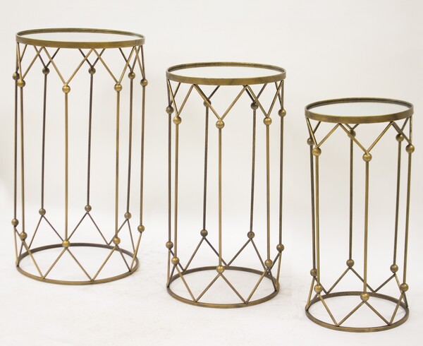 Komplet trzech metalowych stolików, w złotym kolorze, dekorowanych pięknymi, kulistymi detalami na stelażu. Blaty stolików zostały wykonane ze szkła, co stanowi dodatkową dekorację. Stoliki dodadzą urody każdemu wnętrzu. Mogą służyć również jako kwietniki pod rośliny żywe i sztuczne.
