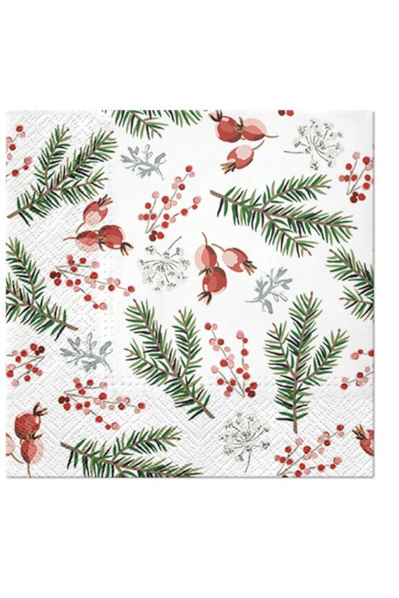 Komplet papierowych serwetek z motywem iglastych gałązek i czerwonych jagód.