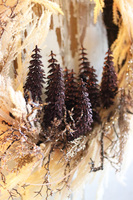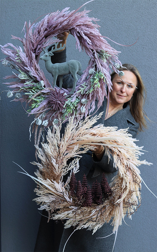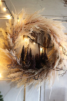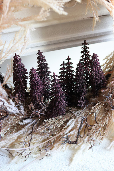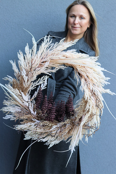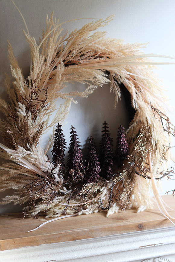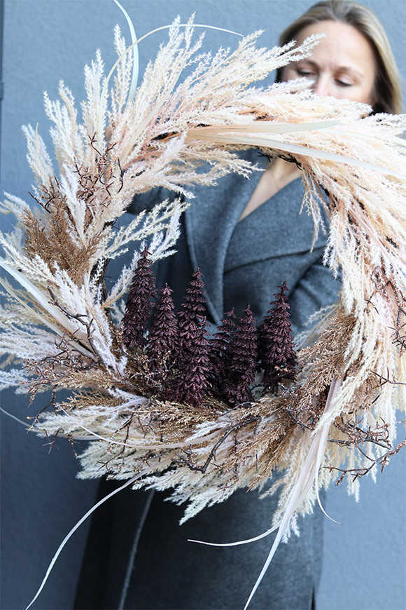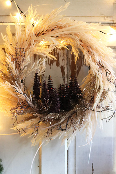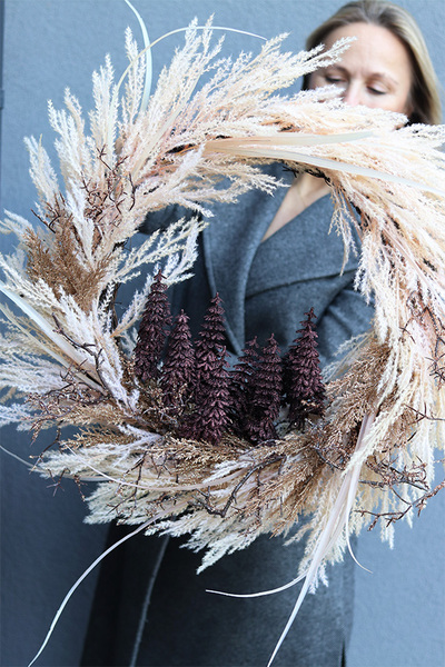 Świąteczny wianek z luźno splecionych, suszonych, beżowych pióropuszy traw, w klimacie boho, dekorowany sztucznymi, bakłażanowymi choinkami ustawionymi na złotych, brokatowych gałązkach drzew.