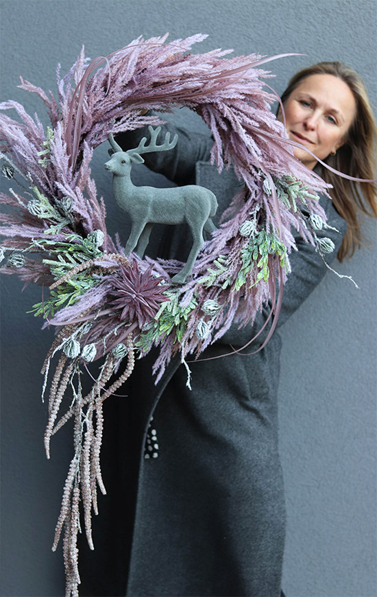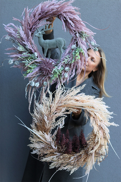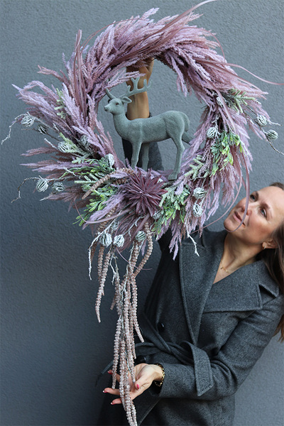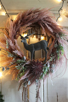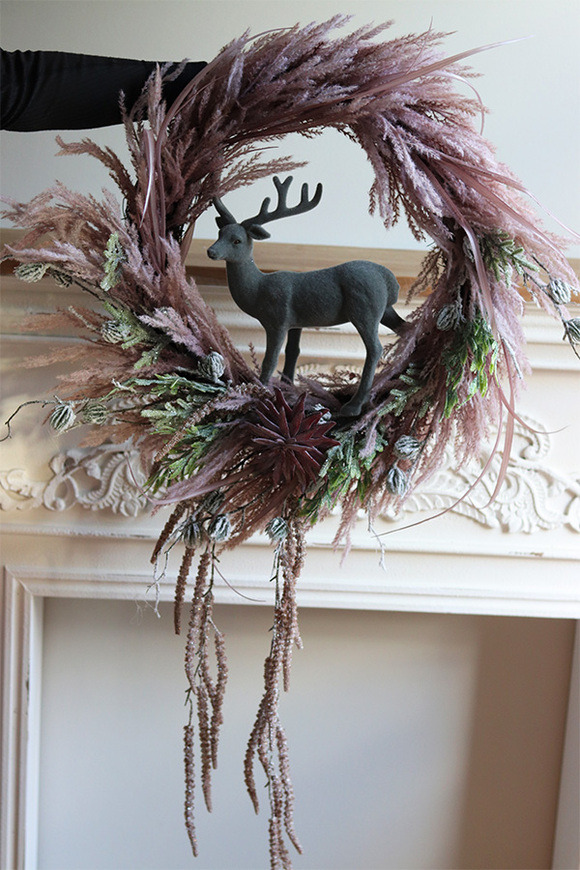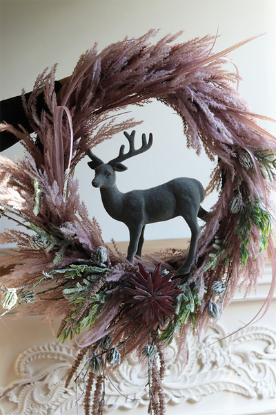 Świąteczny wianek z luźno splecionych, różowych pióropuszy traw i zielonego widłaka, w klimacie boho, dekorowany sztucznymi pędami leszczyny i sukulentem. Centralną część dekoracji stanowi figurka welurowego jelonka w komponujcych z całością barwach.