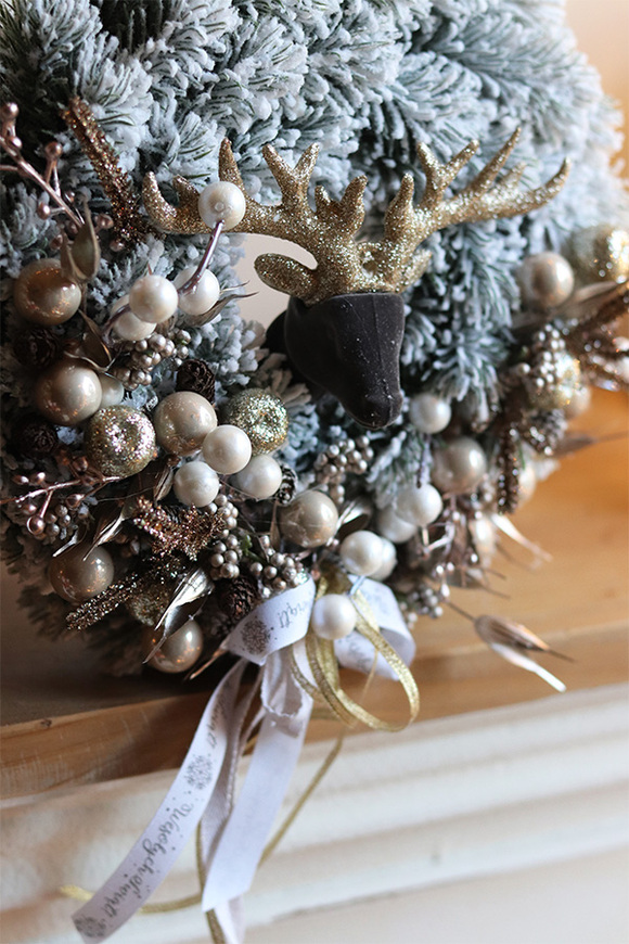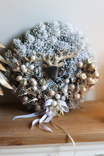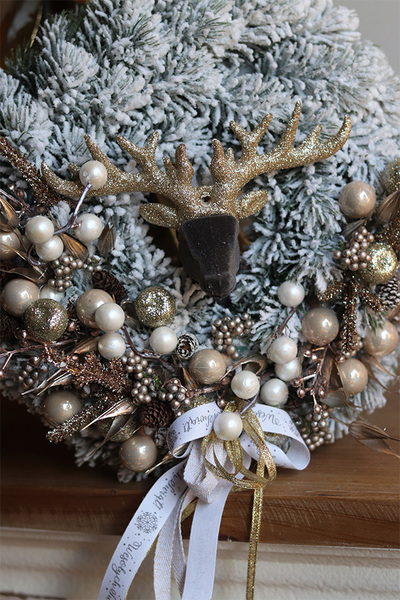 Świąteczny wianek z ośnieżonych, puszystych gałązek sztucznej jodły, urocza dekoracja na drzwi i do wnętrz. Wianek stylizowany w klimacie mroźnej zimy, dekorowany złotymi bombkami, jabłkami, kulkami i reniferem.