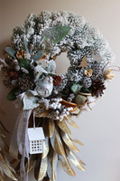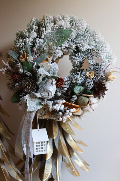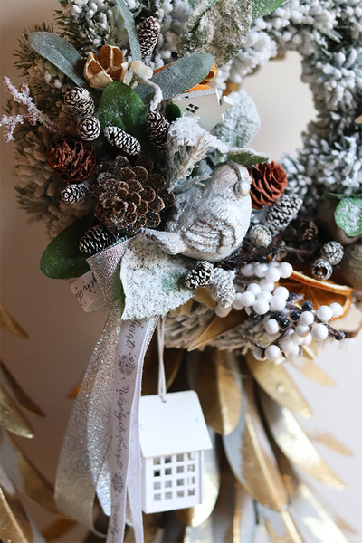 Zimowy wianek z gałązek sztucznej jodły i zielonych liści, sosnowych i egzotycznych szyszek, błyszczących wstążek i kiści złoconych liści luźno zwisających z wianka.