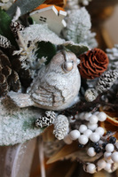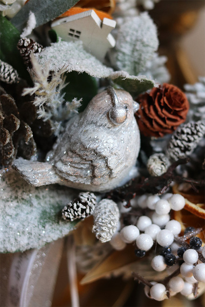 Uroczą ozdobą wianka jest ceramiczny, mieniący się ptaszek i skandynawski biały domek, jako zawieszka.