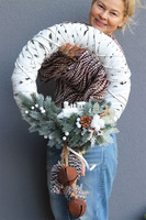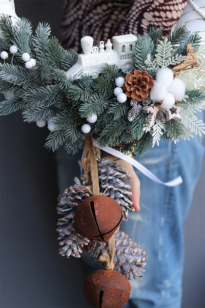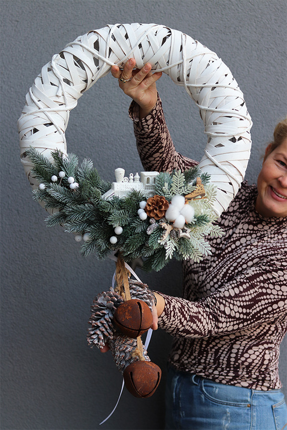 Świąteczny wianek z malowanej na biało egzotycznej trawy, dekorowany srebrnymi gałązkami świerku i figurką biało-brokatowej lokomotywy. Wianek charakteryzuje się elegancką prostotą. Urocze śnieżone kuleczki, naturalne owocostany bawełny i naturalne szyszki sosny dodają wyjątkowego klimatu. Dodatkową ozdobą są luźno wiszące ogromne szyszki i miedziane janczary.