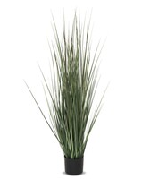 Piękna sztuczna trawa w donicy, doskonale naśladująca żywą roślinę. Liście trawy Nadmorska Wydma mają chłodny, lekko niebieskawy odcień zieleni. Wśród nich znajdują się pojedyncze gałązki z czerwonymi przebarwieniami na końcówkach.