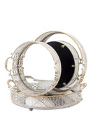 Metalowe lustrzane tace, patery w pięknym złoto-białym kolorze, ozdobione koronkowymi lamówkami, wsparte na fantazyjnie wygiętych nóżkach. Tace to oryginalna dekoracja jadalni, podstawa do serwowania dań i napojów, a także podstawa do świątecznej dekoracji.