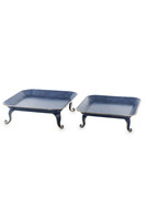Metalowe tace, patery w pieknym granatowym kolorze, ozdobione złotymi lamówkami, wsparte na fantazyjnie wygietych nóżkach. Tace to oryginalna dekoracja jadalni, podstawa do serwowania dań i napojów, a także podstawa do świątecznej dekoracji.